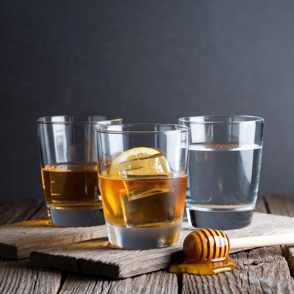 Three glasses on a wooden surface: one with whiskey and ice, one with whiskey only, and one with water. The center glass features a lemon slice on the ice. A honey dipper with dripping honey sits beside the glasses against a dark background.