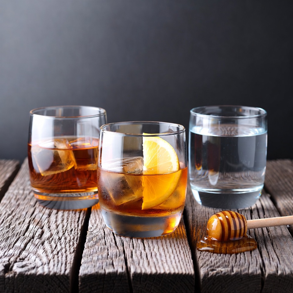 Three glasses on a wooden surface include two whiskey glasses with ice cubes and amber liquid, one garnished with a lemon slice. A clear glass of water sits beside them. A wooden honey dipper with dripping honey rests nearby on a dark background.