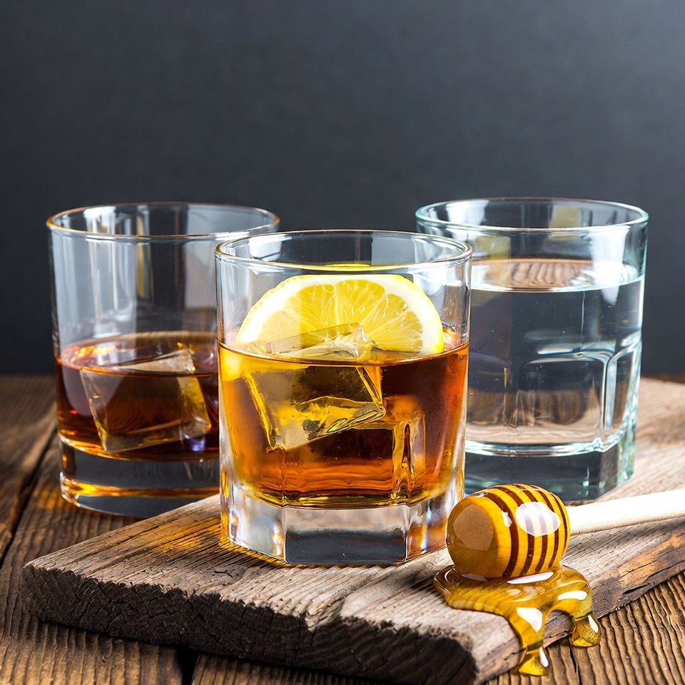 Three glasses on a wooden surface include a whiskey on the rocks with ice cubes, a glass of water, and one garnished with a lemon slice. A wooden honey dipper with dripping honey rests nearby. The setup is against a dark background.