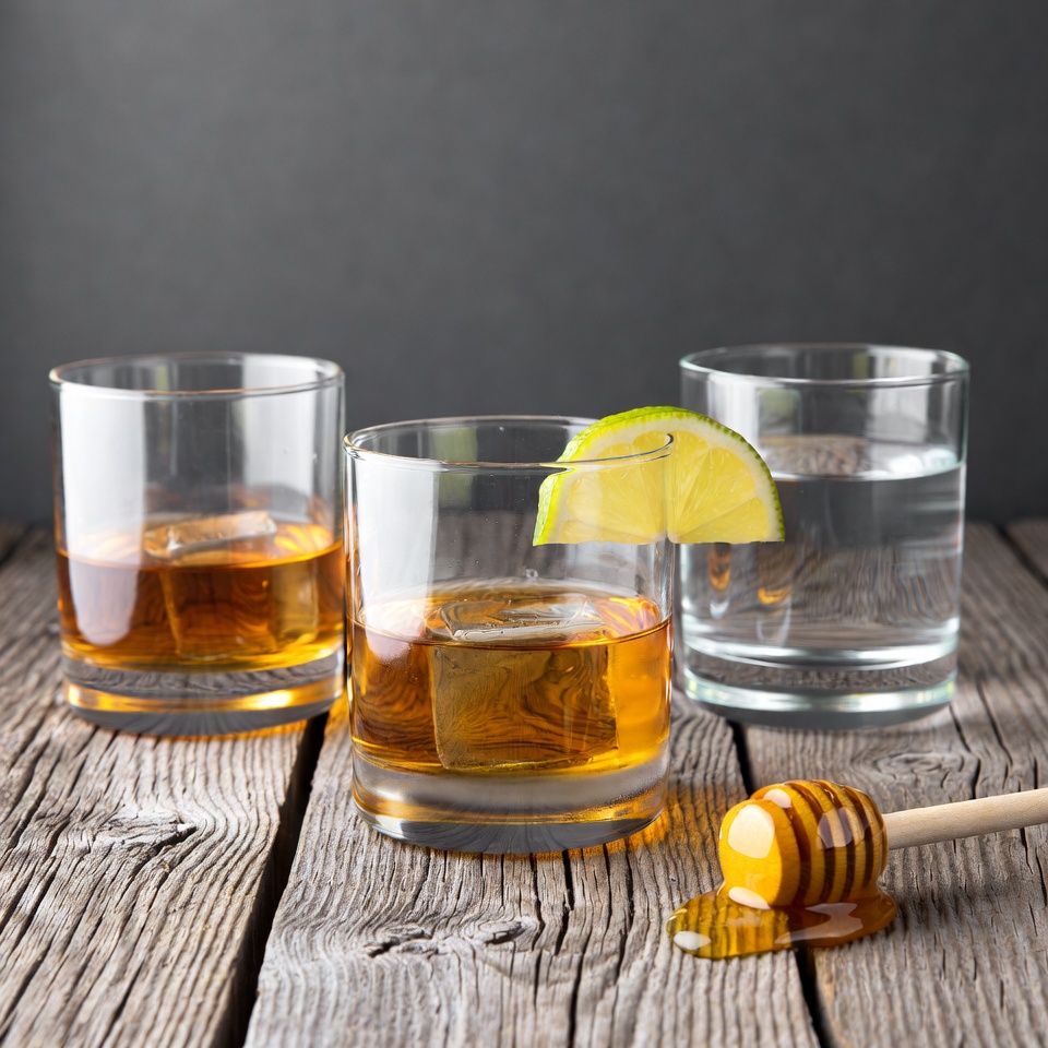 Three glasses on a wooden surface: two with whiskey and ice cubes, one with water. A wooden honey stirrer with dripping honey lies beside them. Lime wedges garnish the top of one whiskey glass and one water glass.