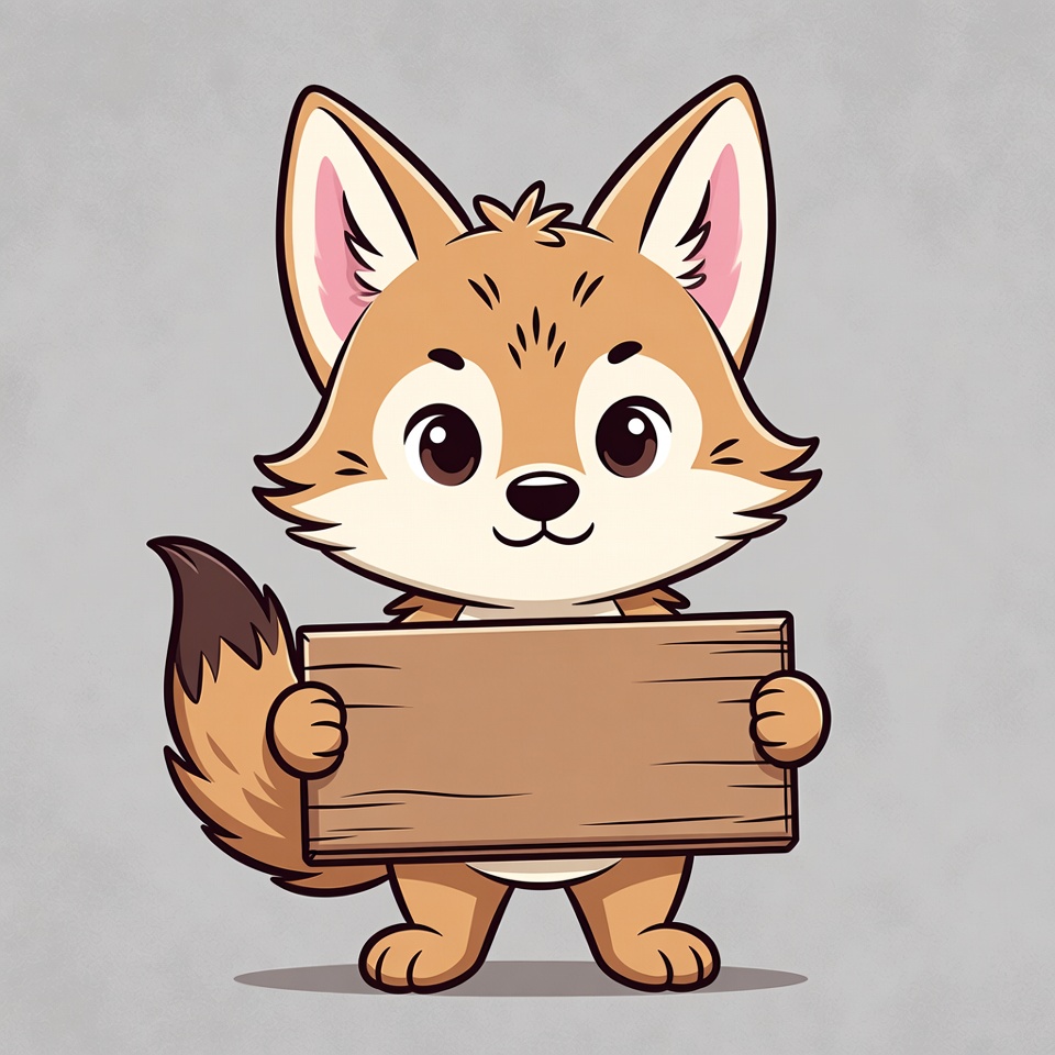 A cartoon fox with large expressive eyes and fluffy fur stands on a gray background. It holds a rectangular wooden sign with its paws. The sign is blank and ready for text.