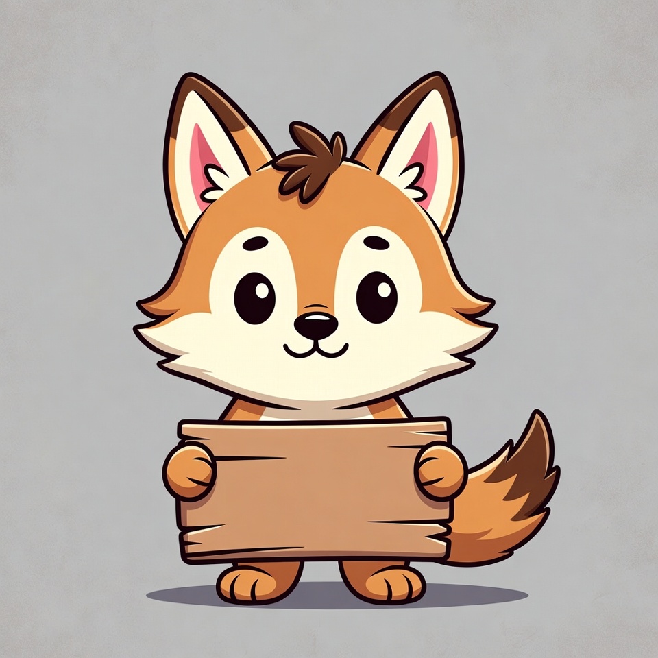 A cartoon fox with large expressive eyes and a smiling mouth holds a blank wooden sign in its paws. The fox has orange fur, white accents on its muzzle and chest, and fluffy ears. It stands on a plain gray background with a cute, playful style.