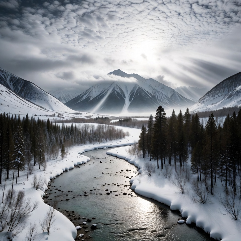 A winding turquoise river flows through a snowy valley surrounded by pine trees and jagged snow-capped mountains. Sunlight breaks through dramatic gray clouds, casting rays over the winter landscape. Snow blankets the ground, trees, and riverbanks, highlighting the serene natural scenery.