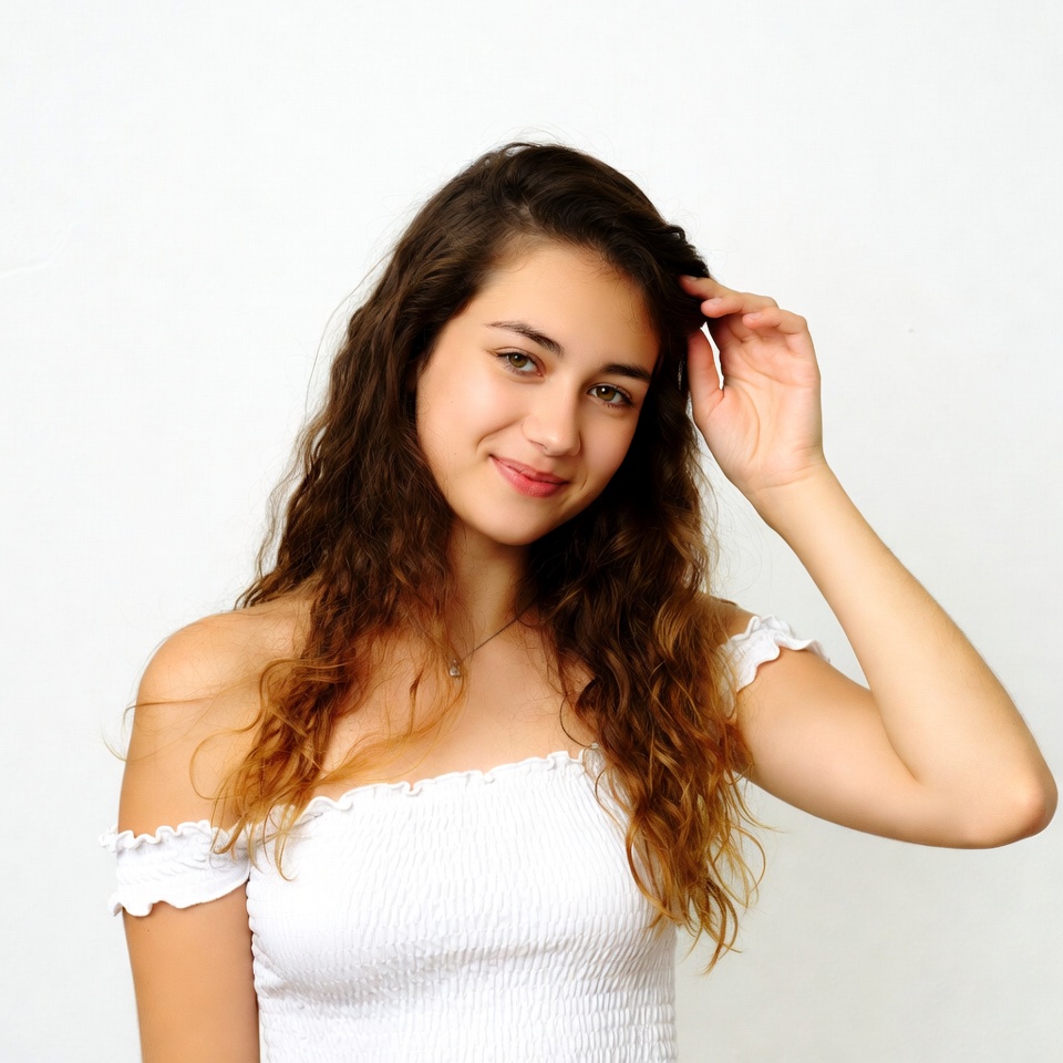 A young woman with long wavy brown hair smiles at the viewer while touching her head with her right hand. She wears an off-shoulder white ruffled top and a delicate necklace. She stands against a plain white background.
