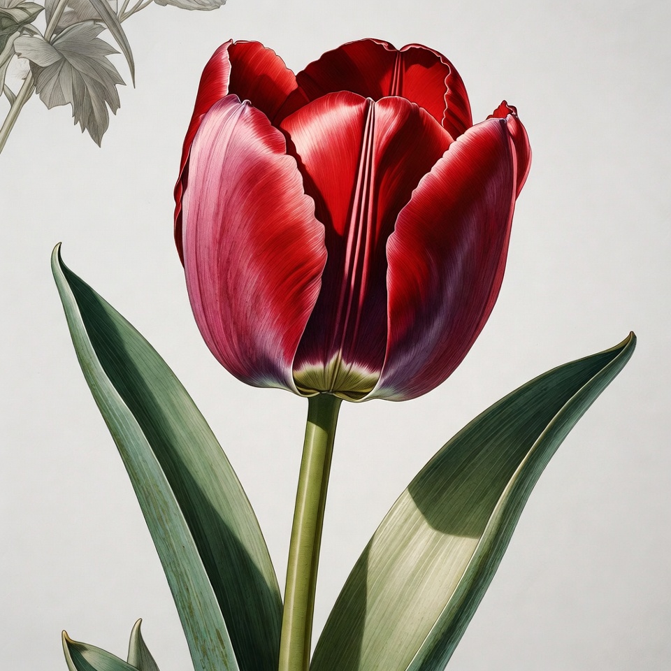 botanical illustration, flower closeup, flower petals, garden flower, green leaves, green stem, isolated background, red flower, spring flower, tulip bloom, tulip flower, tulip stem, vibrant petals, white background, red tulip