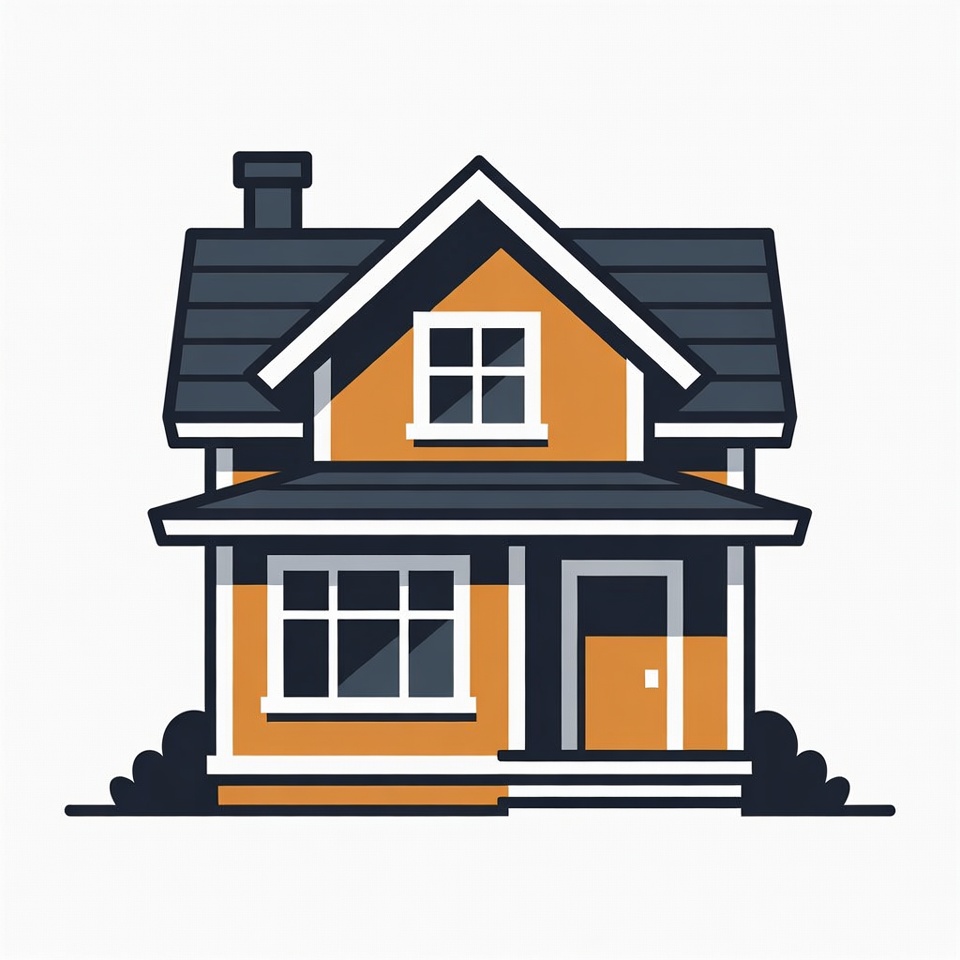 A simple line art illustration of a two-story house features an orange exterior with white trim and a dark gray sloped roof. It has rectangular windows, a front door, a chimney, and small bushes on either side. The house stands on a white isolated background.