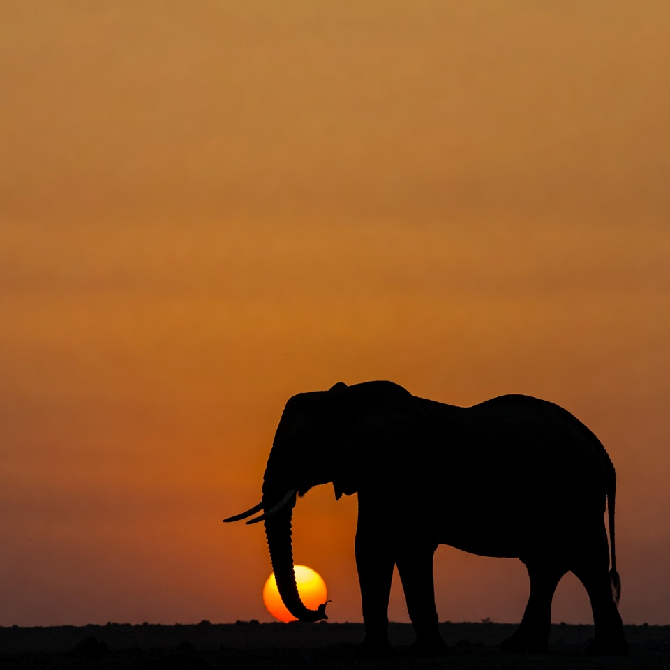 african elephant, animal, dusk, golden hour, isolated background, nature, orange sky, profile, savanna, silhouette, standing elephant, sun, sunset, wildlife, elephant