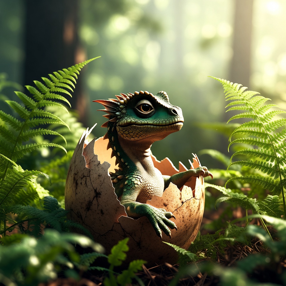 A cute baby dragon with green scales and red spines hatches from a cracked egg in a lush forest. It sits surrounded by ferns and sunlight filtering through tall trees. The scene features vibrant greenery and a mystical atmosphere.