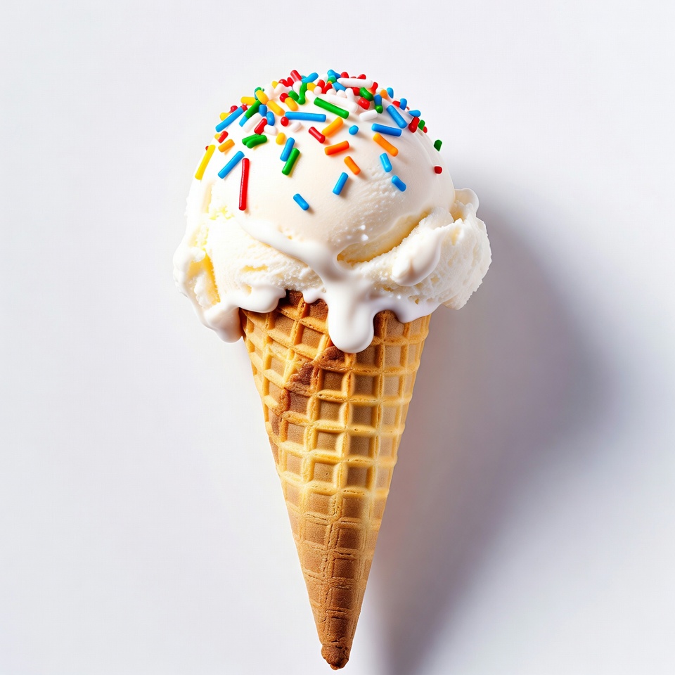 colorful sprinkles, cone, dessert, food, ice cream cone, isolated background, melting ice cream, rainbow sprinkles, sprinkles, sweet treat, vanilla ice cream, vanilla scoop, waffle cone, white background, ice cream