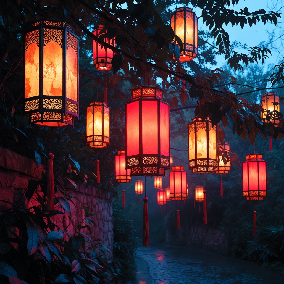 Multiple red and orange Chinese lanterns with intricate designs hang from tree branches over a stone pathway. The scene is set against a twilight sky with lush green foliage and a stone wall. A red lantern post stands beside the dimly lit cobblestone path.