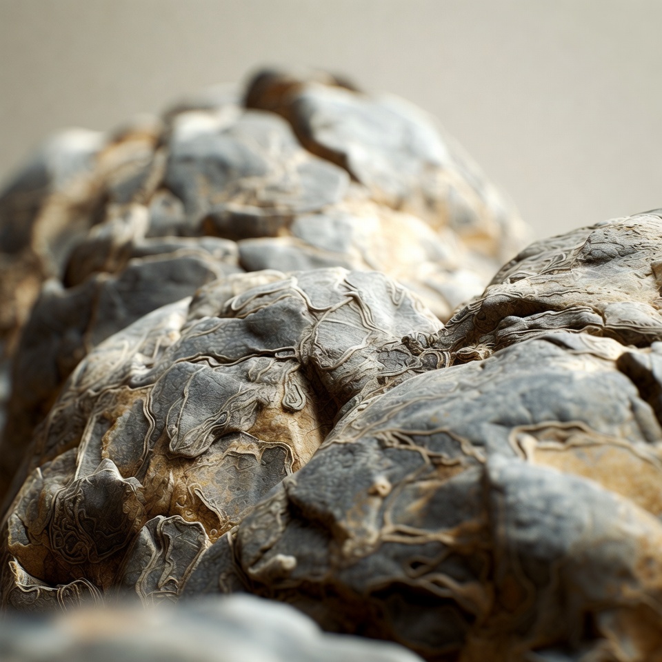 A close-up view shows a cluster of rugged, gray rocks with intricate, cracked surfaces and subtle yellowish tones. The textured surfaces feature deep fissures and layered patterns. The rocks are set against a soft beige background.