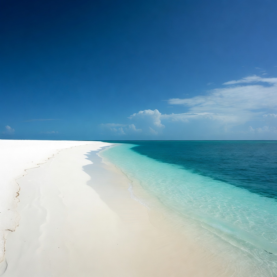 A pristine white sand beach curves along the edge of vibrant turquoise ocean waters under a clear blue sky. Gentle waves lap at the shore, with scattered clouds visible in the distance. The scene features a sharp contrast between the bright sand and deep blue horizon.