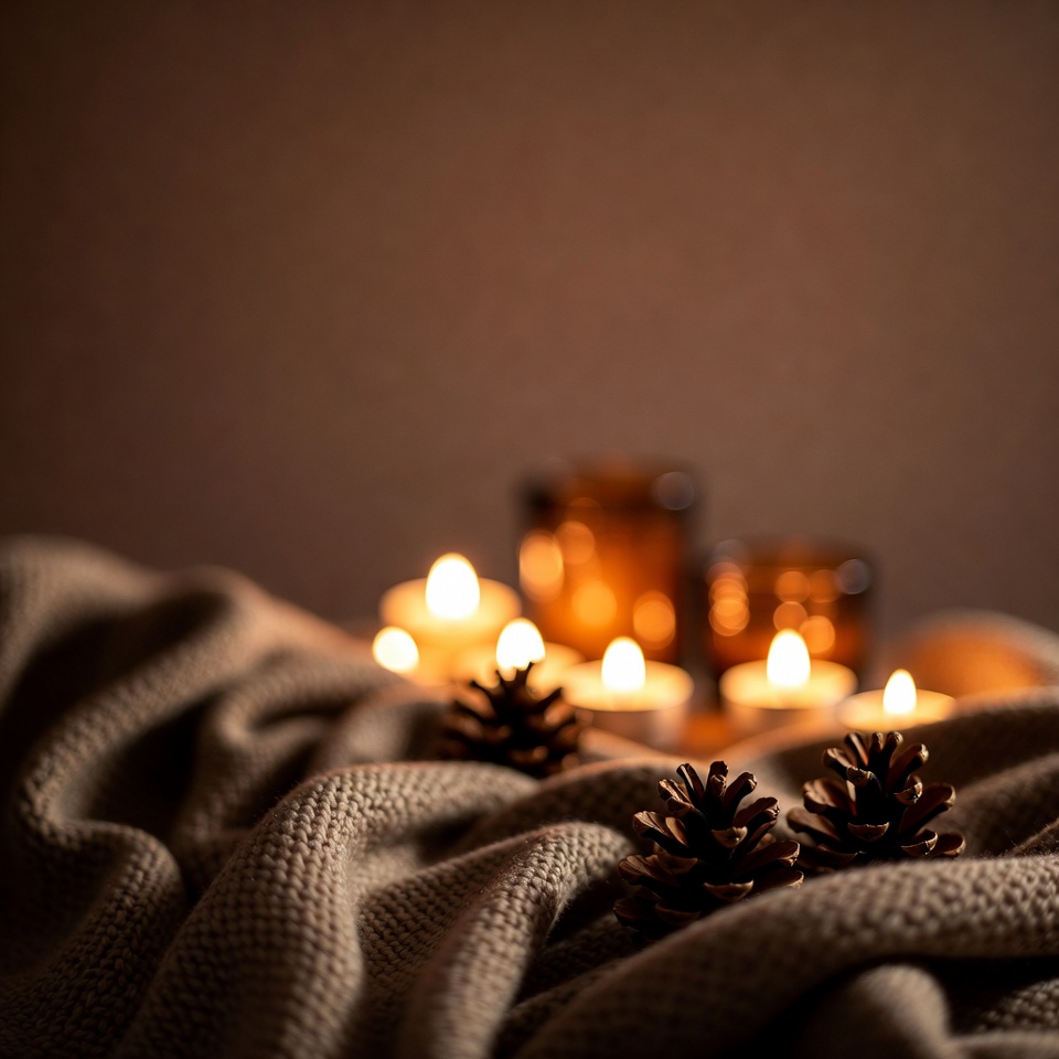 Christmas, Thanksgiving, ambiance, autumn, blurred background, bokeh, brown tones, candles, cozy, festive, glass holders, glowing flames, holiday decor, home decor, knitted blanket, natural light, relaxation, rustic, seasonal, soft fabric, still life, tea lights, textured blanket, warm lighting, winter, wooden elements, pine cones