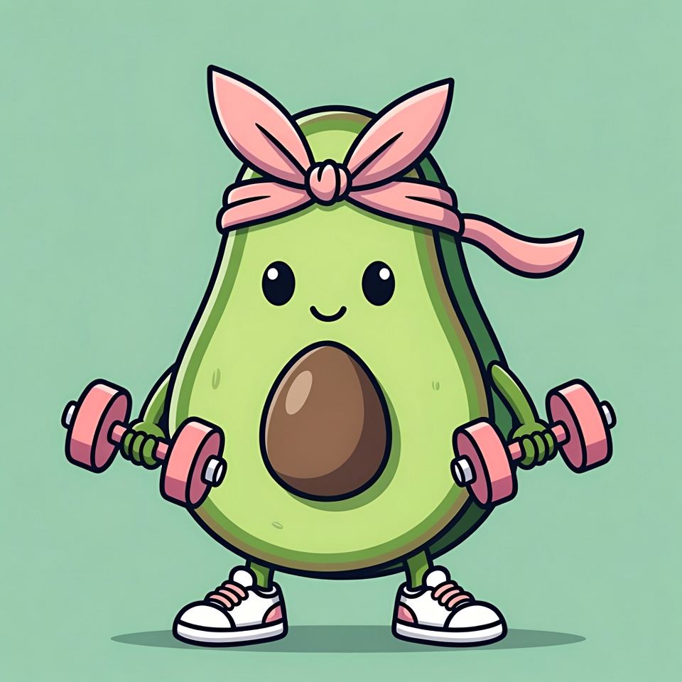 A cartoon avocado with big eyes and a smiling face wears pink headband and sneakers. It holds pink dumbbells in its arms while standing on a light green background. The illustration features a brown pit visible in the green avocado body.