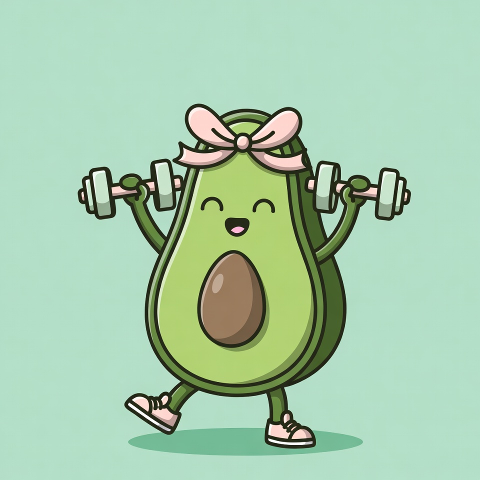 A cartoon avocado character dressed as a girl with a pink bow lifts dumbbells energetically. She wears pink sneakers and has a happy smiling face with rosy cheeks. The illustration features a light green background.