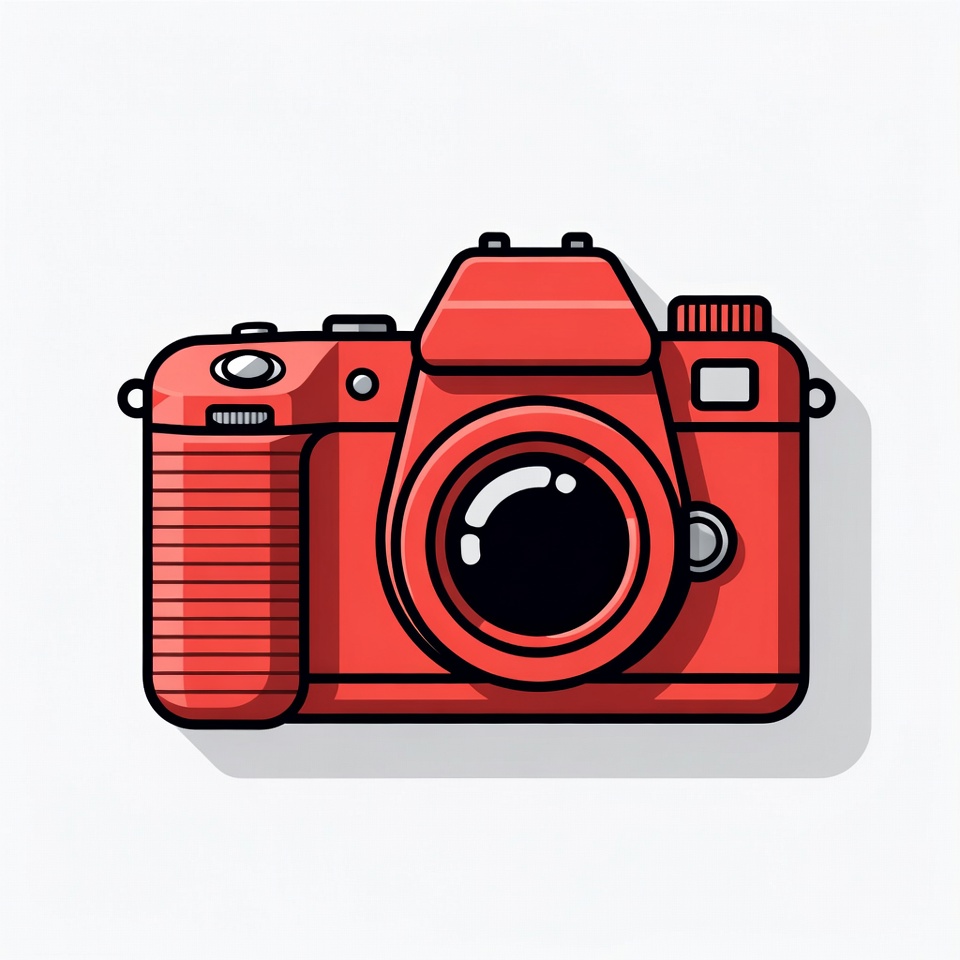 A vibrant red DSLR camera is depicted in a flat vector illustration style. It features a prominent lens, detailed grip, and buttons on a clean white background with a subtle shadow. The design emphasizes clean lines and bold colors typical of modern clipart.