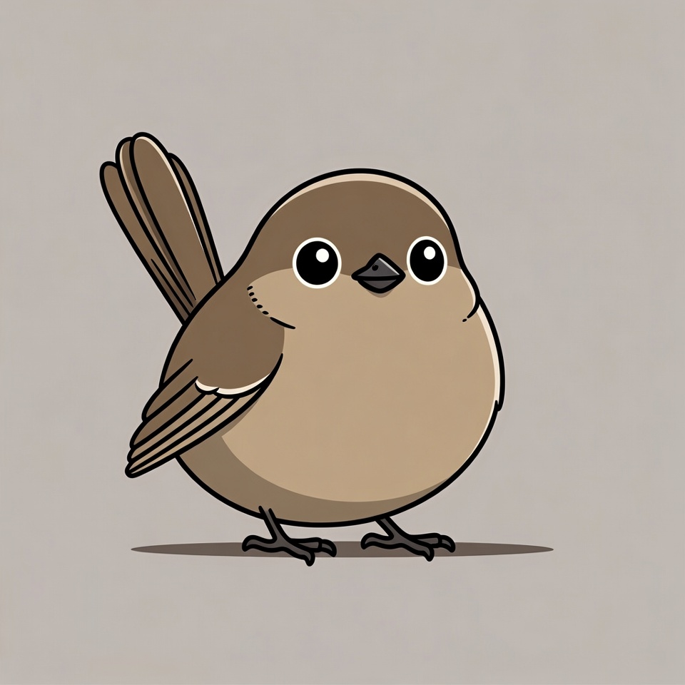 A cute, chubby brown sparrow with large round eyes stands on thin legs against a plain gray background. The bird features fluffy feathers, a small beak, and a raised wing in a charming cartoon style. The illustration has clean black outlines and soft shading.