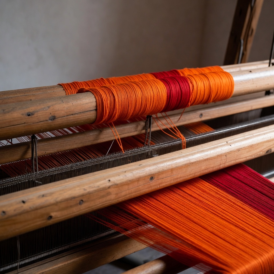 bamboo poles, closeup, craft, detailed, fabric production, handicraft, metal heddles, orange threads, red threads, textile, threads, traditional loom, vibrant colors, warp threads, weaving, weaving machine, wooden loom, workshop, yarn, loom