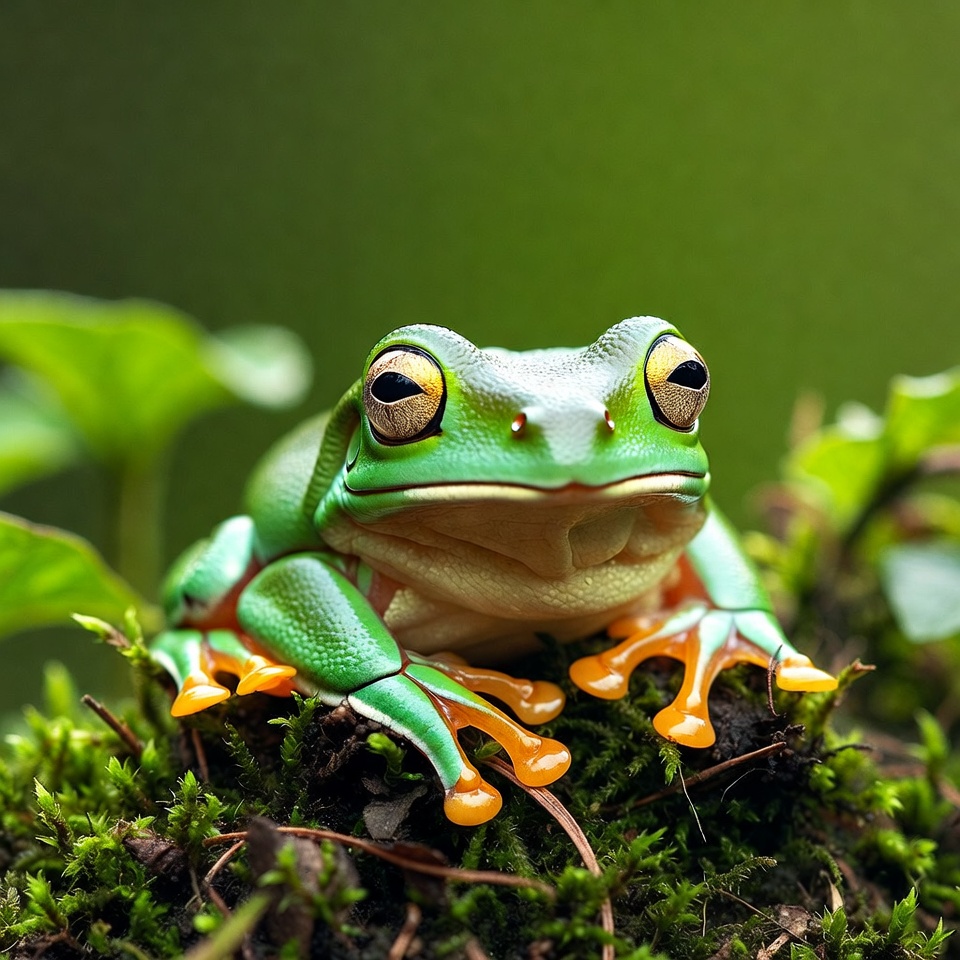 A vibrant green tree frog with orange toes sits on a mossy surface surrounded by green leaves. Its large eyes gaze forward with yellow irises and black pupils. The frog's smooth skin glistens in the natural light.