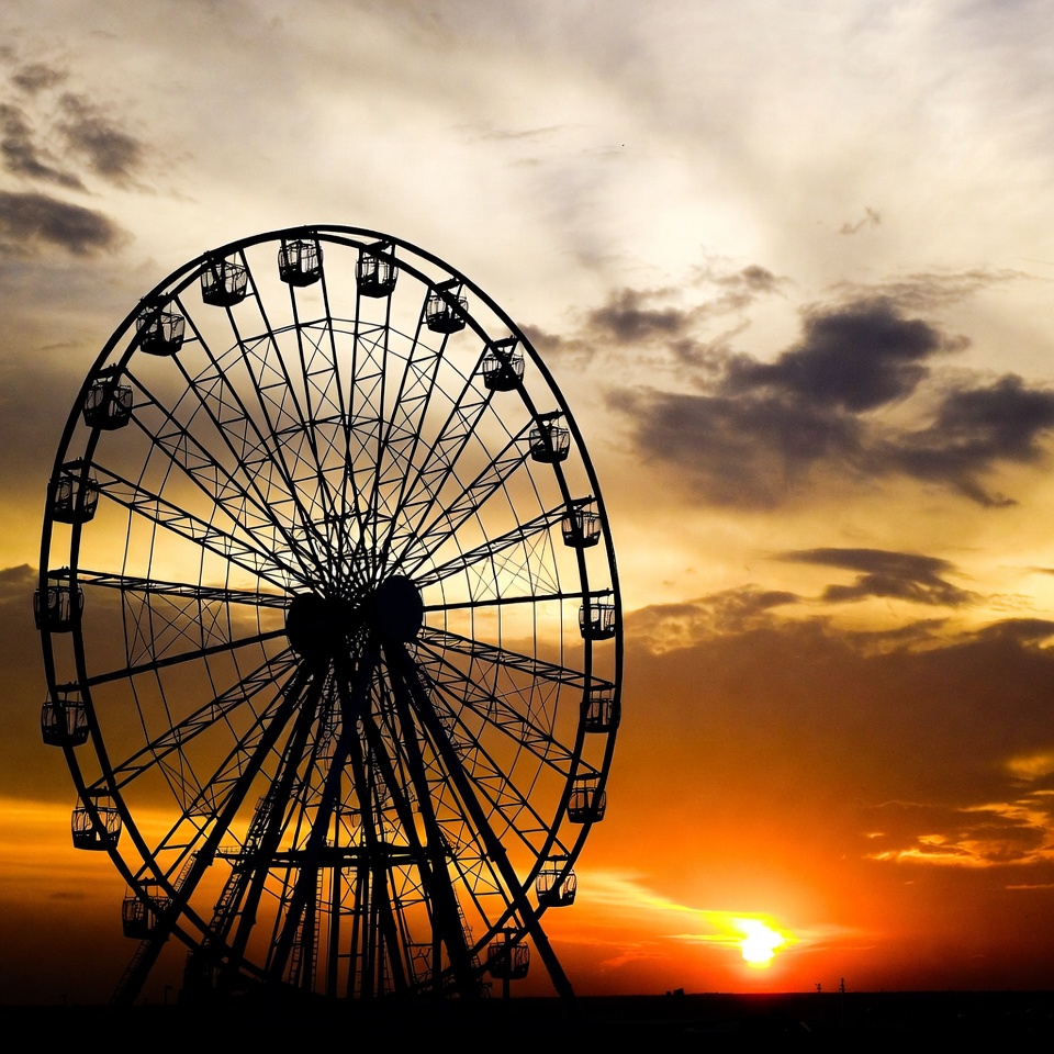 amusement park, big wheel, carnival, clouds, dramatic sky, dusk, evening, fairground, golden hour, horizon, landscape, observation wheel, orange sky, outdoor, ride, silhouette, sky, sun, sunset, twilight, Ferris wheel