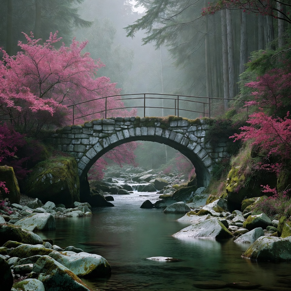 arch bridge, arched bridge, cherry blossoms, coniferous trees, evergreen trees, floral bridge, fog, foggy woods, forest path, green water, landscape, misty forest, moss, mountain stream, nature, pink flowers, river, rocks, serene, spring flowers, stream, trail bridge, waterfall, woodland, stone bridge