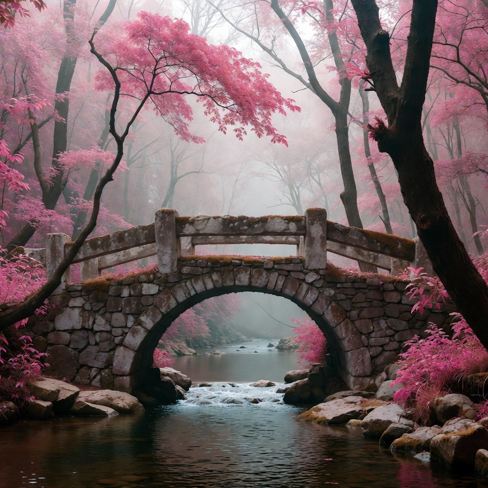 arch bridge, blossoms, branches, dreamy landscape, enchanted forest, floral forest, fog, garden bridge, landscape, misty forest, moss, nature, petals, pink trees, river, rocks, serene path, spring scenery, stone bridge, stream, surreal, trees, vibrant pink, water, woods, cherry blossom