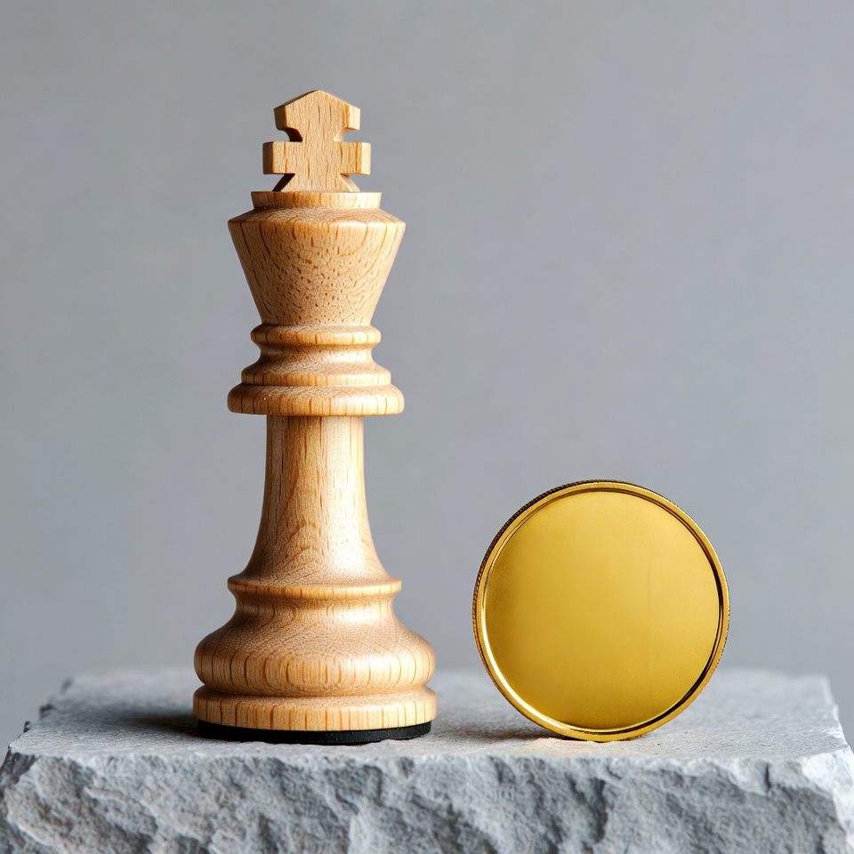 chess, chess piece, coin, game piece, gold coin, golden coin, gray background, isolated background, king piece, stone surface, strategy, wood carving, wooden king, chess king