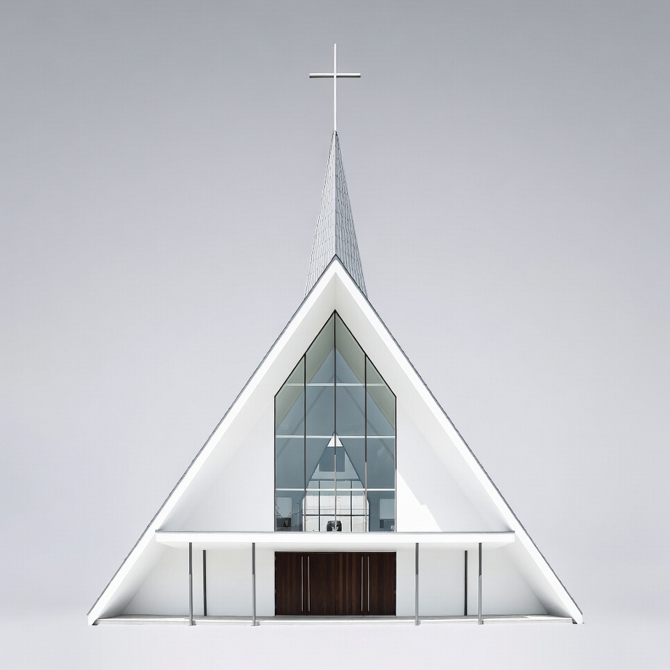 architecture, building, chapel, christian, cross, facade, glass windows, isolated background, minimalism, modern church, religious, steeple, triangular roof, white church, wooden doors, worship place, church