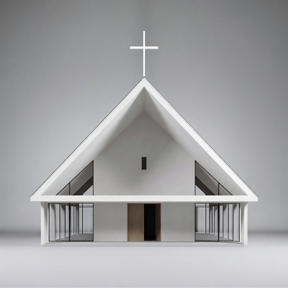 A modern white church features a striking triangular roof and a tall cross on top. It has large glass windows on both sides of the entrance and a central wooden door. The building is rendered in a 3D style against a plain gray background.