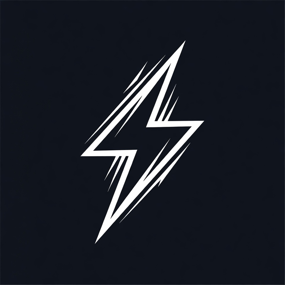 A sharp white lightning bolt icon with dynamic jagged edges and motion lines is centered on a solid black background. The design features bold outlines and speed streaks for an energetic effect. It appears as a minimalist vector graphic suitable for logos or symbols.