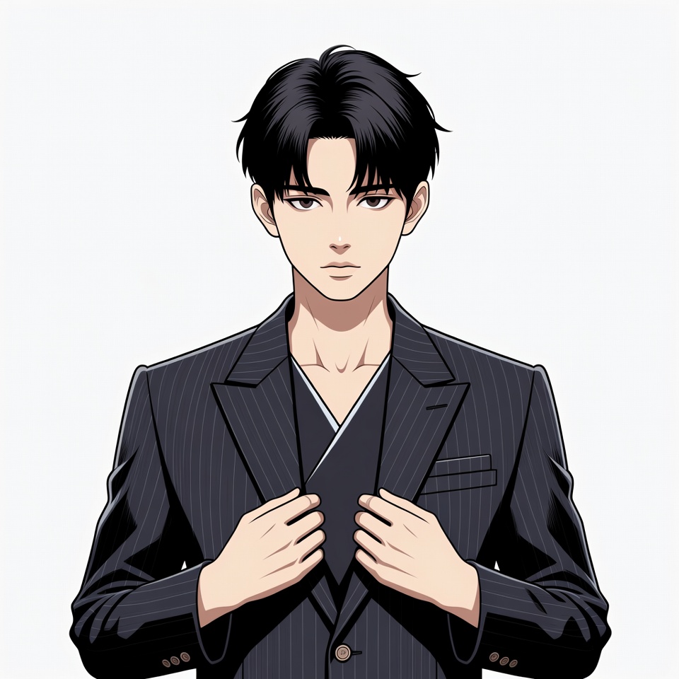 An anime-style illustration of a young man with straight black hair stands frontally against a white background. He wears a dark pinstripe suit with a V-neck shirt and adjusts the lapels with both hands. His expression is serious with sharp eyes and defined facial features.