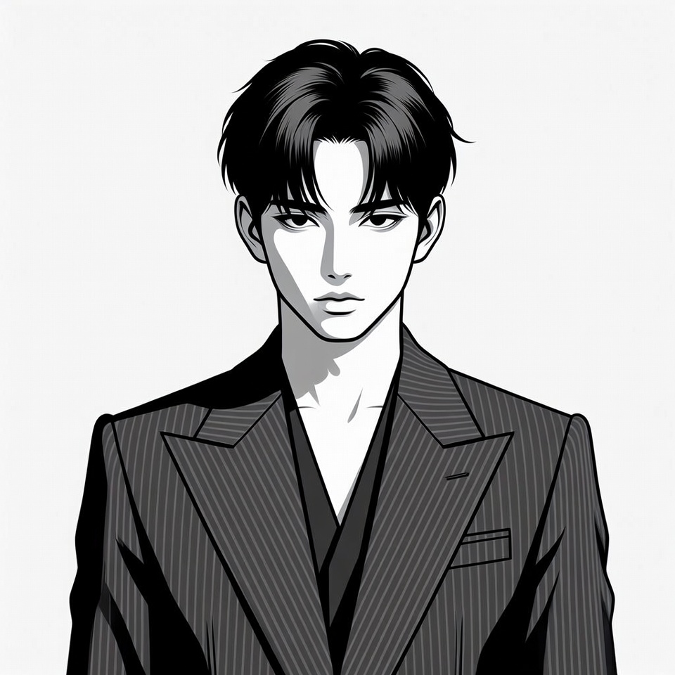 A black and white anime-style illustration depicts a handsome young man with sharp features and black hair styled forward. He wears a tailored gray suit with a deep V-neck shirt, standing against an isolated white background. His expression is serious with subtle shading enhancing the contours of his face and clothing.