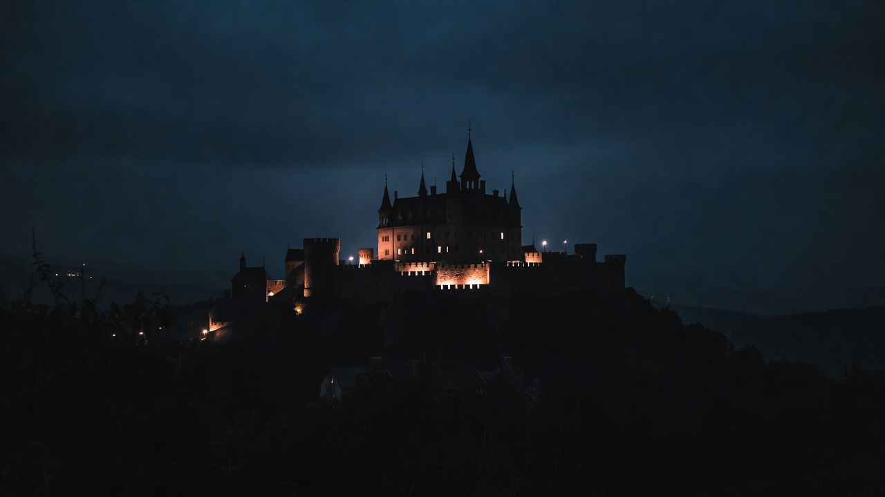 A majestic castle atop a rocky island is illuminated at night against a dark cloudy sky. Warm lights glow from the castle's towers and walls, highlighting its Gothic architecture. The structure sits isolated on a hill surrounded by shadowy landscape.