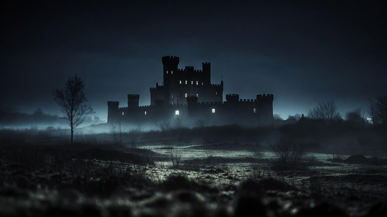 A large medieval castle stands silhouetted against a dark night sky with illuminated windows. Bare trees and foggy mist surround the structure on a barren field. The scene is shrouded in deep shadows and atmospheric fog.