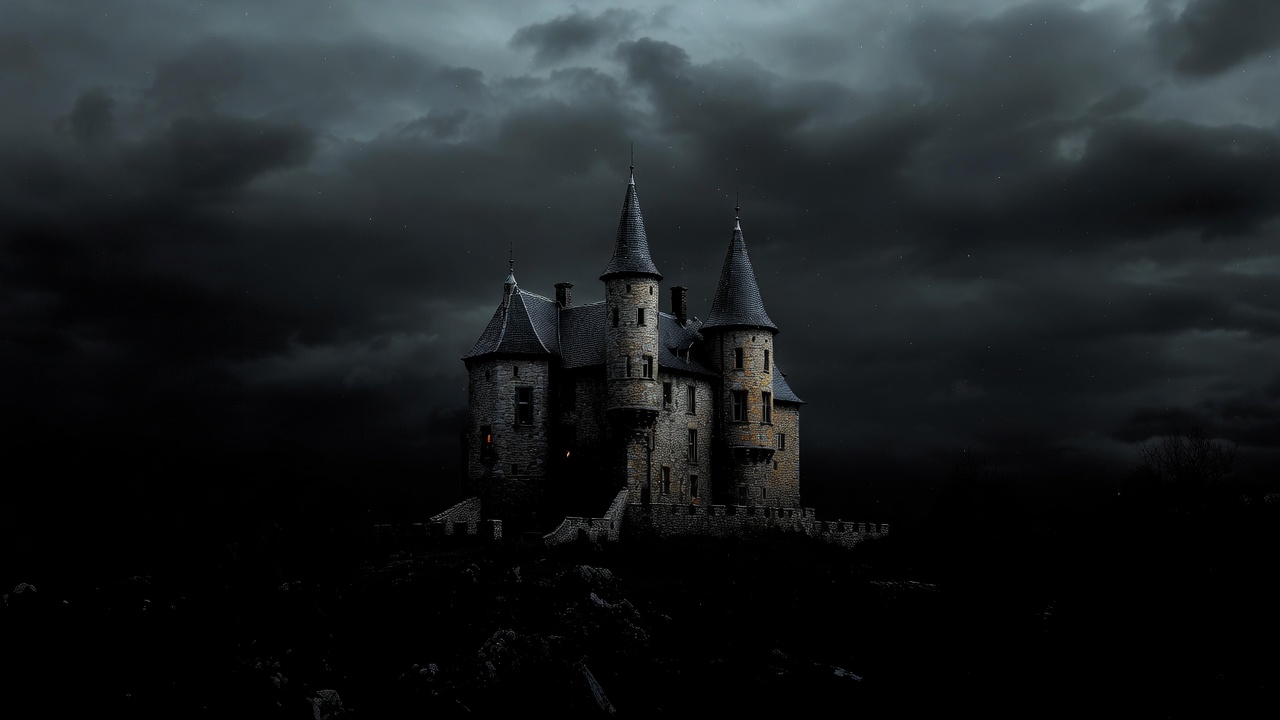 A medieval castle with multiple tall towers sits atop a rocky hill under a dark, stormy sky. The stone structure features pointed turrets and narrow windows, illuminated faintly against the black clouds and surrounding darkness. Lightning and heavy clouds dominate the ominous atmosphere.
