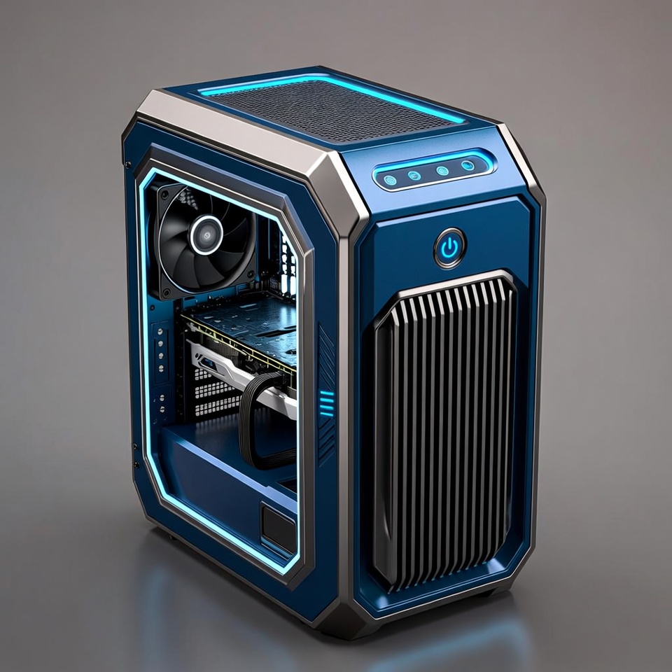 3D render, LED lights, PC build, PC tower, RGB lights, blue PC, computer case, computer hardware, cooling fans, custom PC, desktop PC, futuristic PC, gaming computer, graphics card, high-end PC, isolated background, motherboard, gaming PC