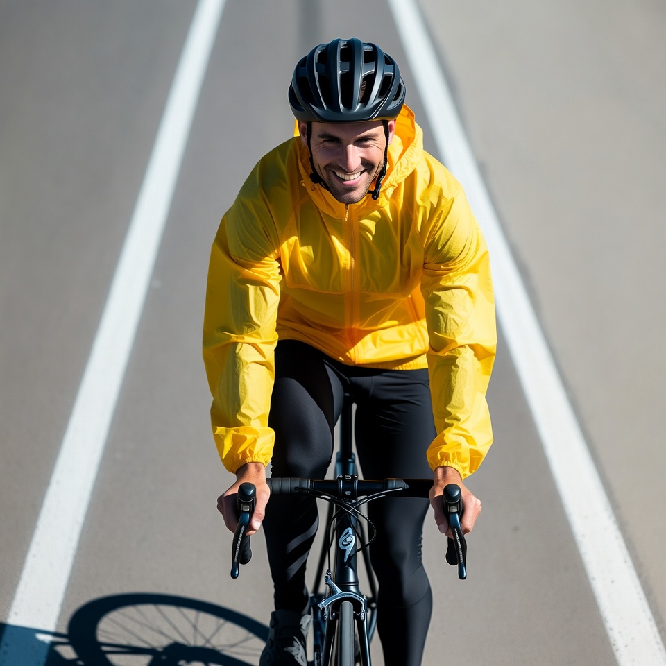 A man wearing a black helmet and bright yellow rain jacket rides a road bike on a marked asphalt path. He smiles while leaning forward, gripping the handlebars with black cycling shorts visible. The bike's wheels and his shadow are cast on the smooth gray road with white lane markings.