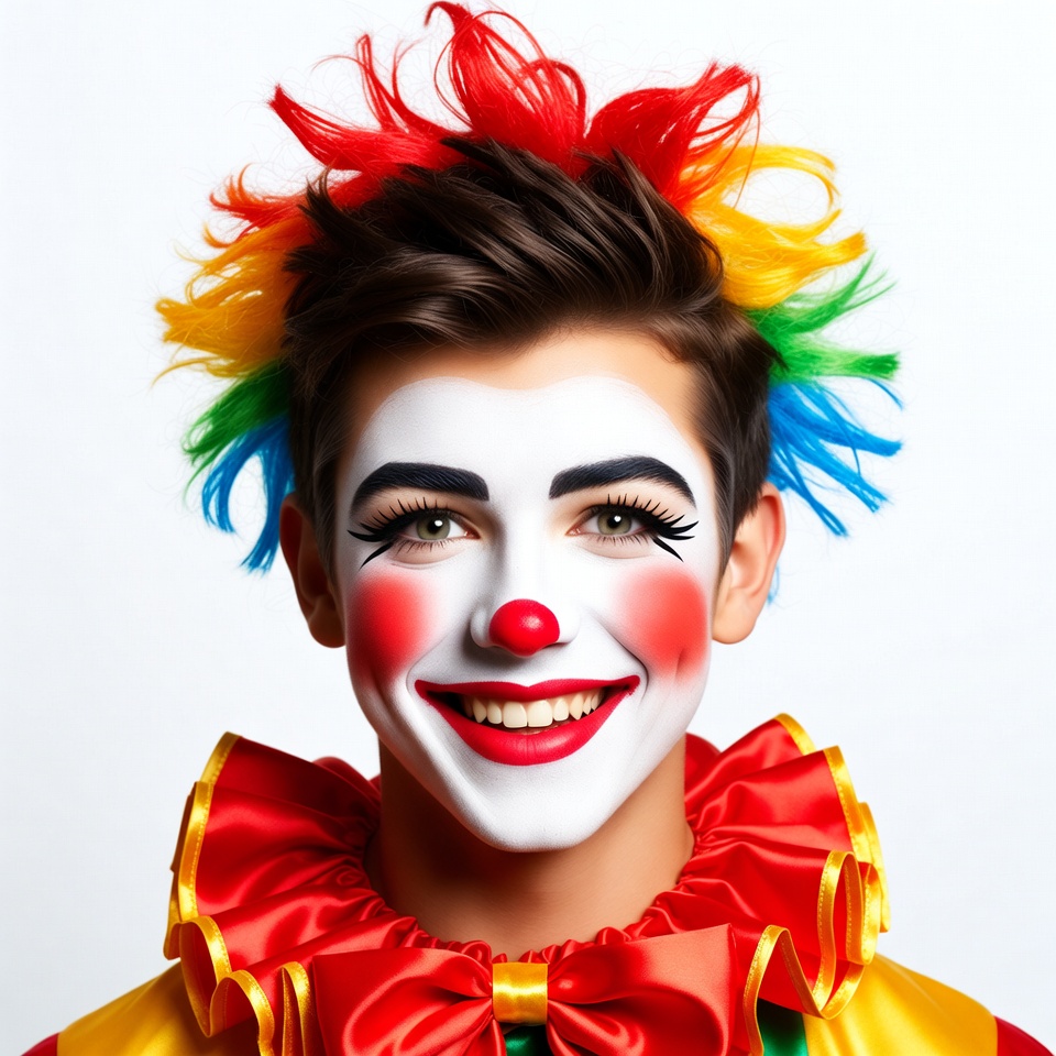 boy clown, circus costume, clown makeup, face paint, funny, gold accents, happy clown, isolated background, joyful expression, makeup, male, multicolored hair, performer, portrait, red bow, red cheeks, red nose, ruffled collar, smiling, spiky hair, vibrant colors, white face paint, young man, clown