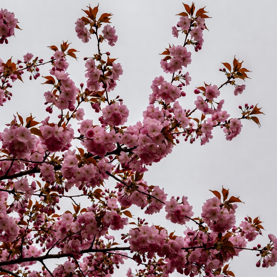 blooms, blossom clusters, branches, buds, cherry tree, floral, flowering branches, flowers, gray sky, isolated background, leaves, nature, outdoor, petals, pink flowers, pink petals, sakura, spring, tree, cherry blossoms