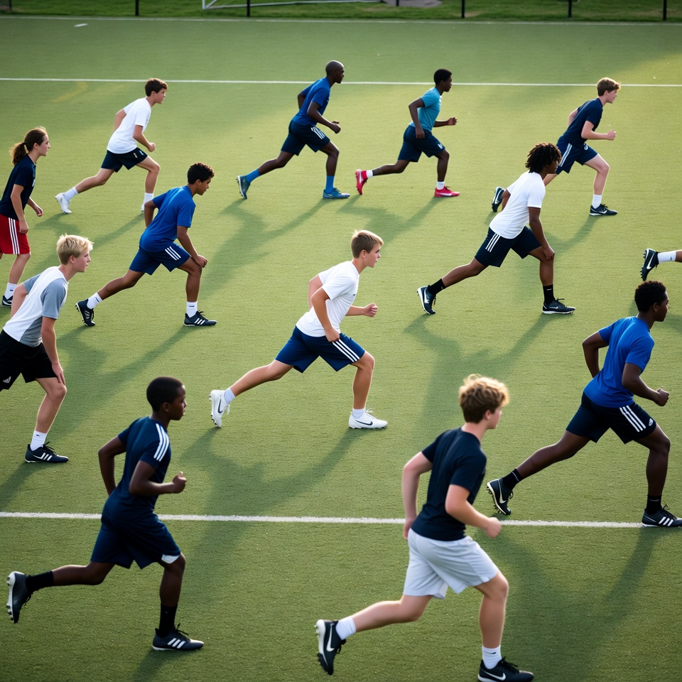 African-American, Multiracial, White, athletic shorts, dynamic poses, fence, field practice, fitness, green turf, group exercise, group run, jogging, male, outdoor sports, running, sneakers, soccer field, soccer pitch, sports field, sports team, sprinting, t-shirts, team training, teenagers, track running, young athletes, boys