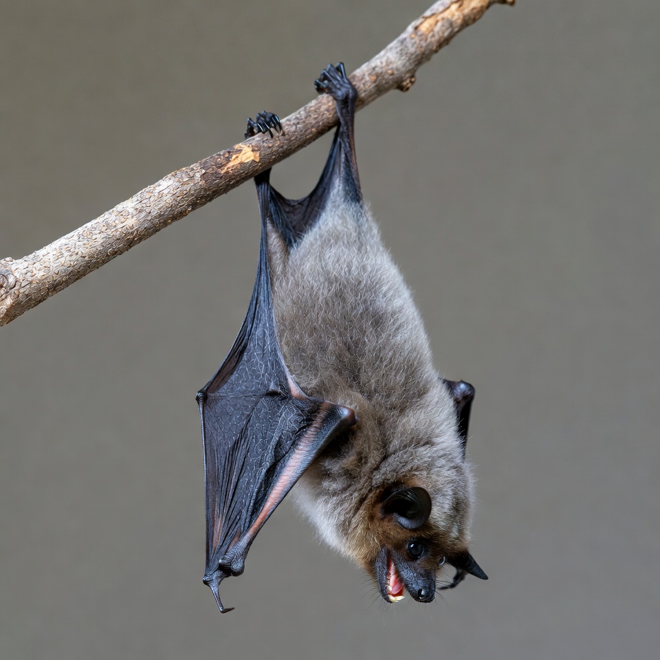 A gray bat hangs upside down from a thin wooden branch against a plain gray background. Its wings are spread open, revealing dark membranes, and its mouth is open showing teeth. The bat's fur is fluffy and its ears are large and pointed.