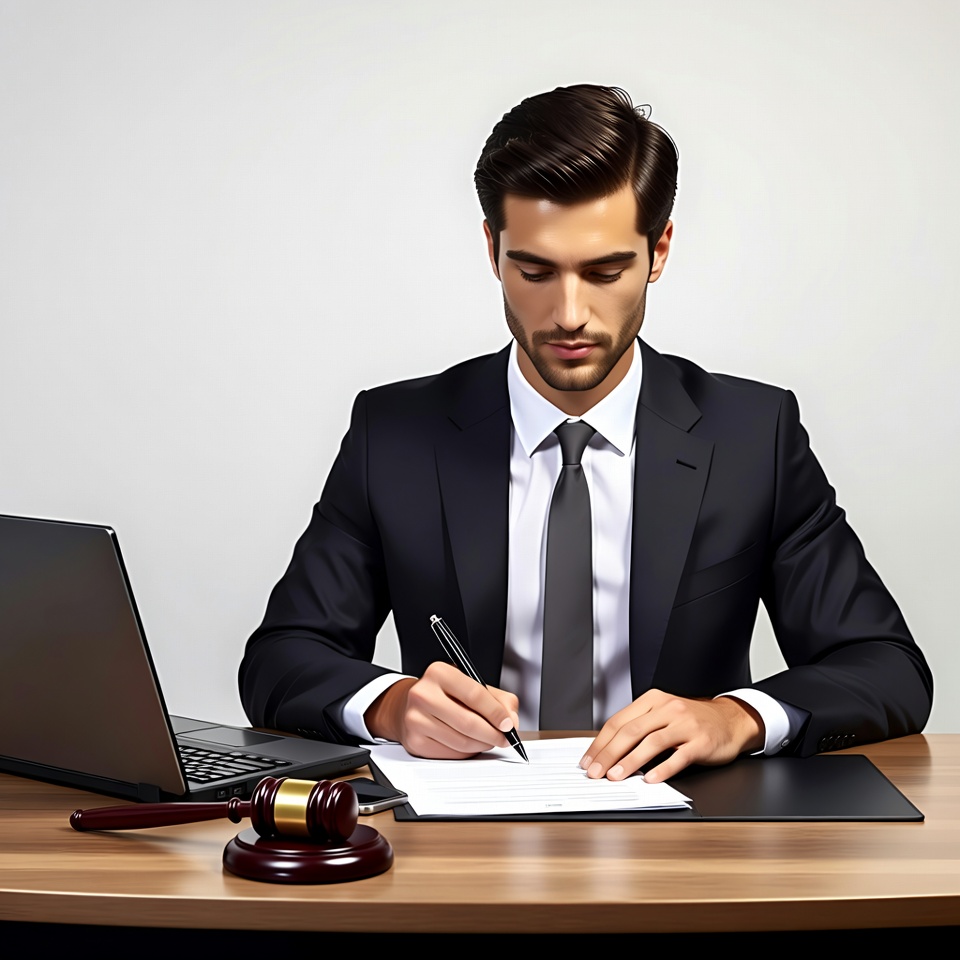 White, dark hair, desk, focused, gavel, isolated background, laptop, lawyer, male, office, paperwork, pen, professional, signing document, suit, tie, wooden desk, man