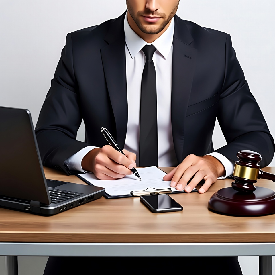 A man in a dark suit and white shirt sits at a wooden desk, writing on a notepad with a pen. A laptop, smartphone, and wooden gavel are placed on the desk in front of him. He faces forward against a plain white background.