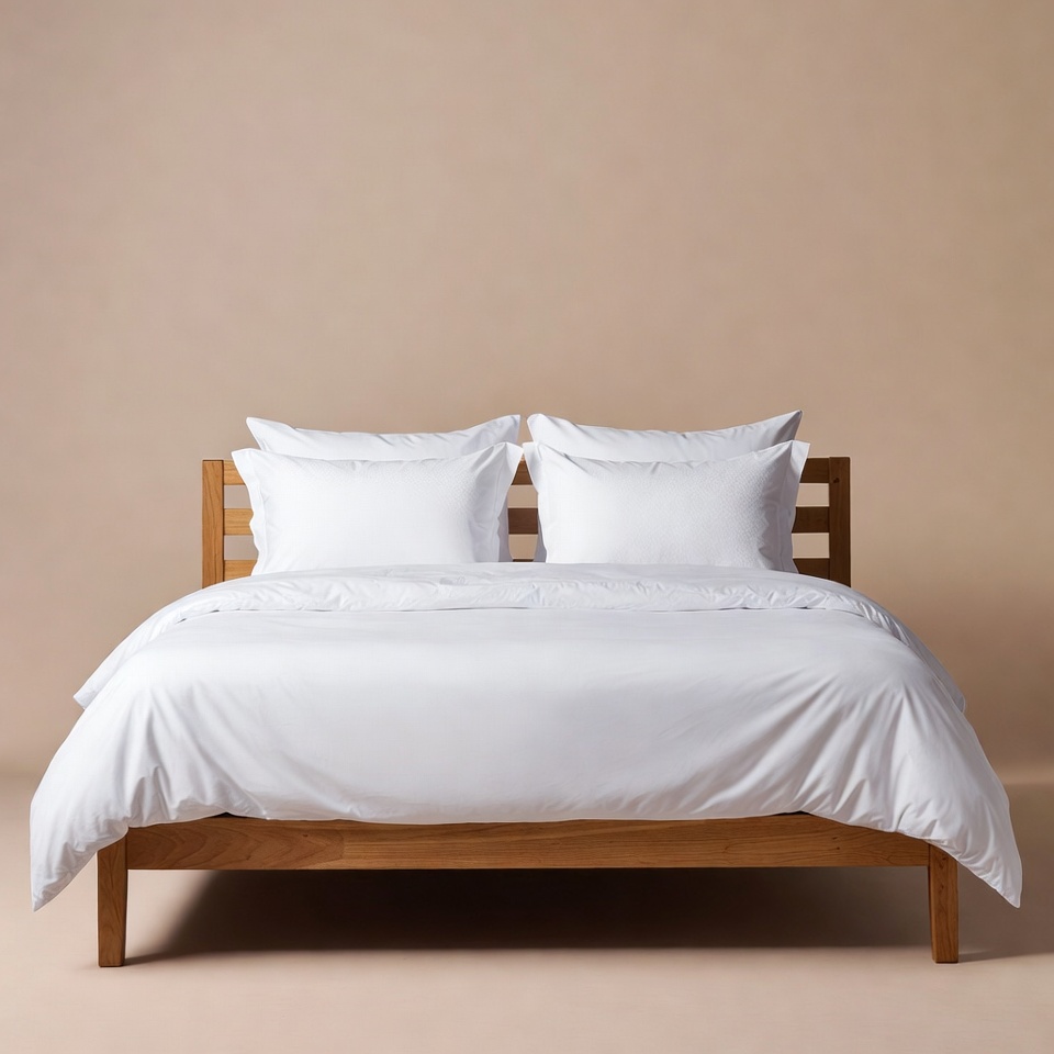 bed frame, bedding set, bedroom furniture, beige background, crisp linens, duvet, empty bed, fluffy pillows, headboard, home decor, hotel bed, interior design, luxury bed, mattress, oak bed, pillows, white bedding, white sheets, wooden bed, bed