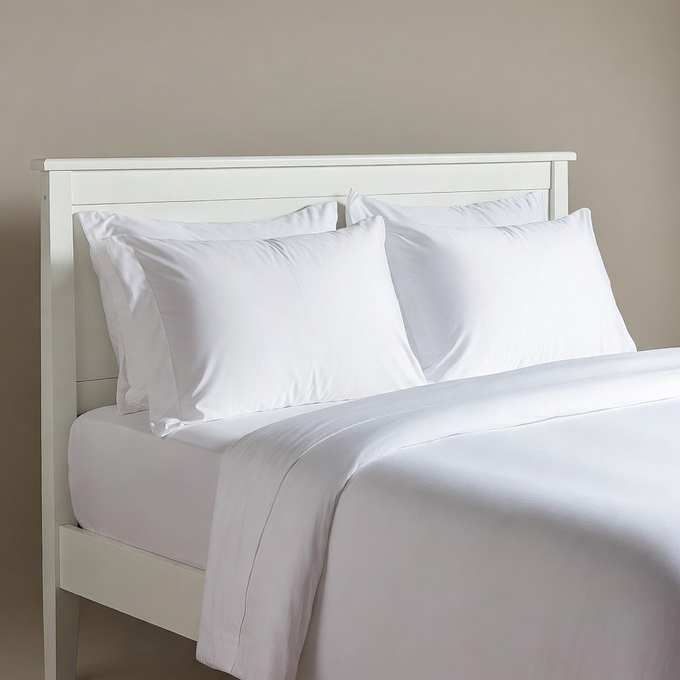 A white wooden bed frame features crisp white pillows and a matching duvet. The bed sits against a plain beige wall with multiple pillows neatly arranged on top. The setup appears clean and minimalistic.