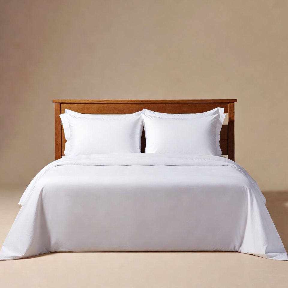 A wooden bed frame with a tall headboard holds crisp white sheets and pillows. The bedding is neatly tucked and smoothed over the mattress. The bed sits centered against a plain beige background.