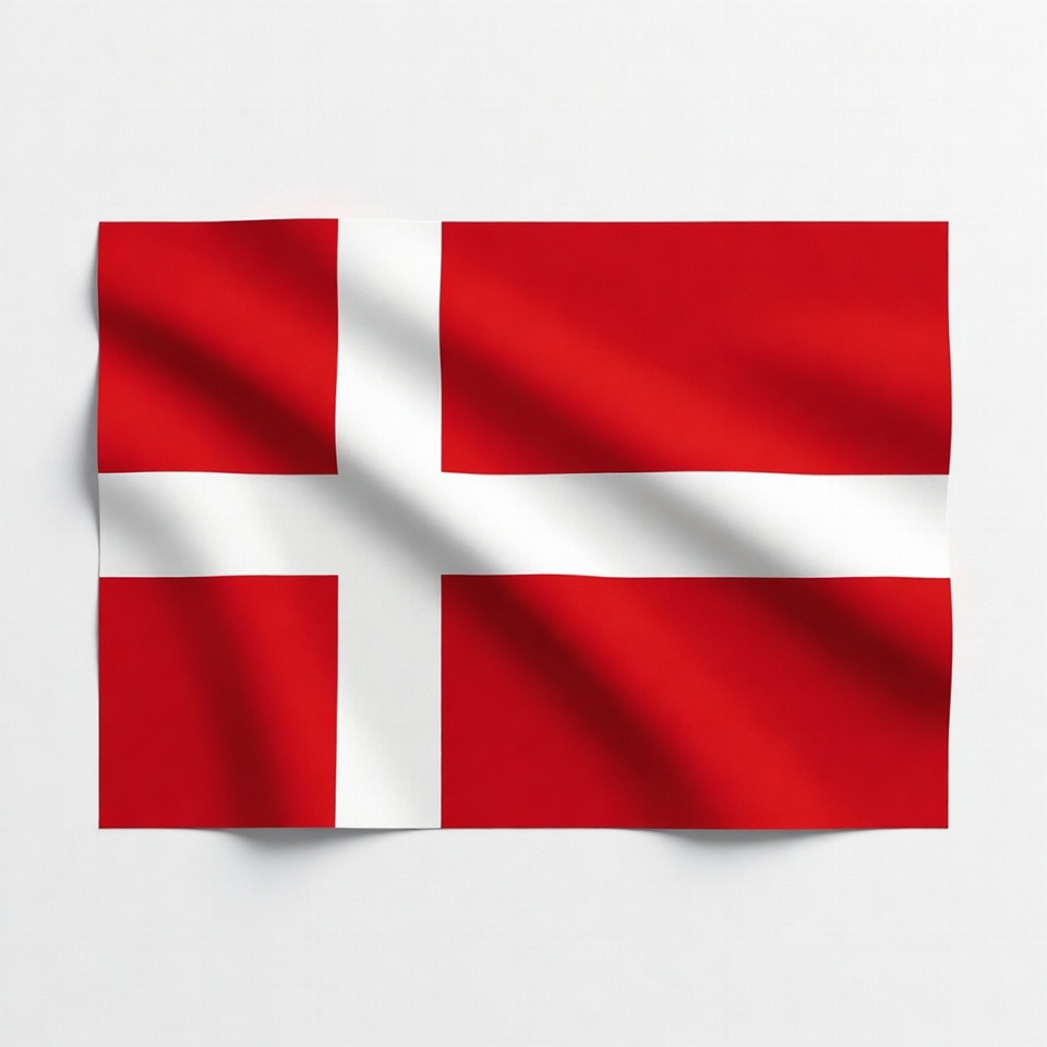 A vibrant red Danish flag with a white Nordic cross waves gently against a plain white background. The flag's fabric appears realistic with folds and creases. It is centered and isolated for clear visibility.