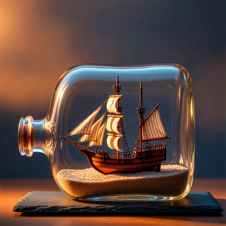 adventure, bottle ship, clear glass, craftsmanship, decoration, detailed model, display, glass bottle, isolated background, maritime, miniature ship, model ship, nautical, ocean theme, pirate ship, sailing ship, sand, seafaring, ship model, sunset glow, vintage ship, warm lighting, white sails, wooden ship, ship in bottle