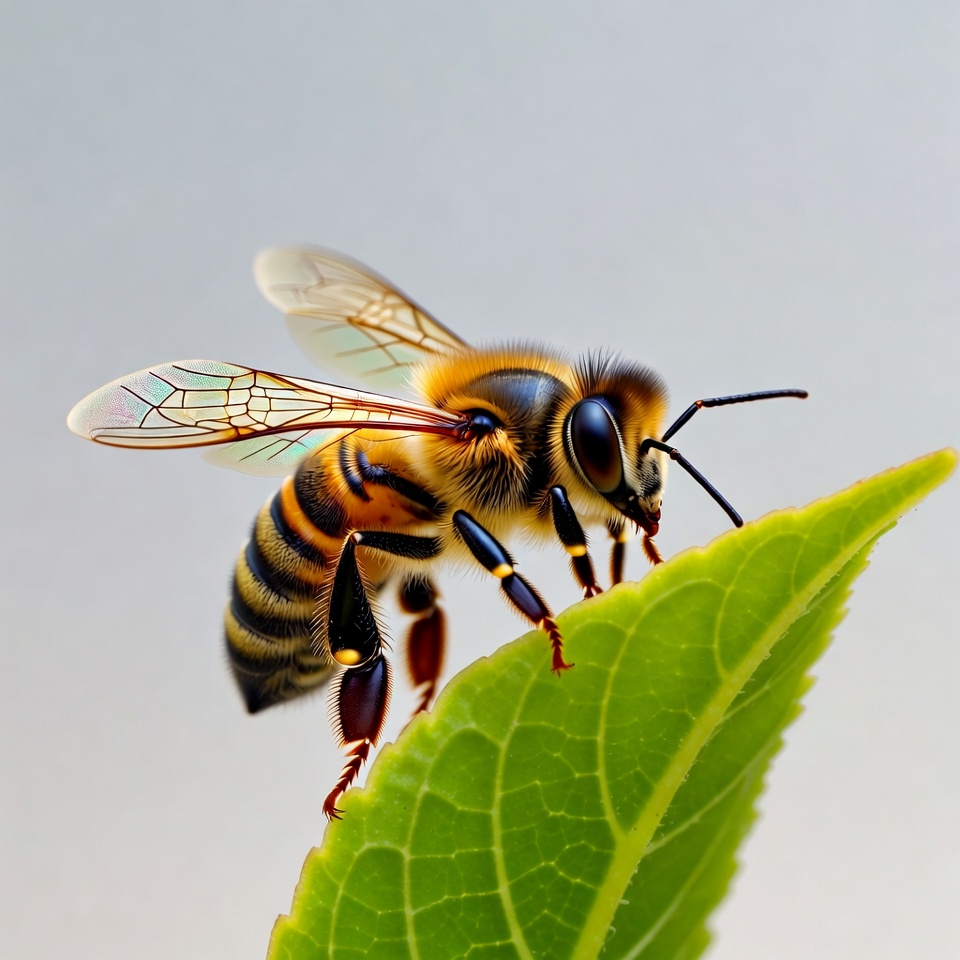 A detailed honey bee with yellow and black stripes clings to a fresh green leaf. Its translucent wings are spread out, and its legs grip the leaf edge firmly. The bee faces forward with prominent compound eyes and antennae.