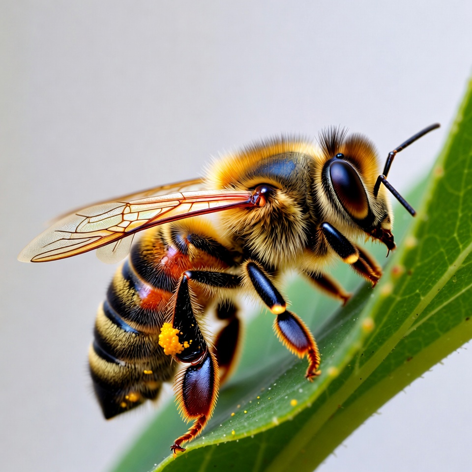 A detailed honey bee with yellow and black stripes clings to a green leaf. Its wings are partially spread, and pollen is visible on its legs. The bee's large compound eyes and fuzzy body are prominently featured against the isolated background.